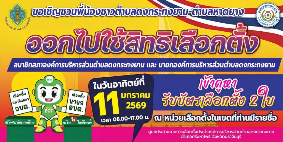 ขอเชิญชวนพี่น้องชาวตำบลดงกระทงยาม-ตำบลหาดยาง ไปใช้สิทธิเลือกตั้งในวันอาทิตย์ที่ 11 มกราคม 2569