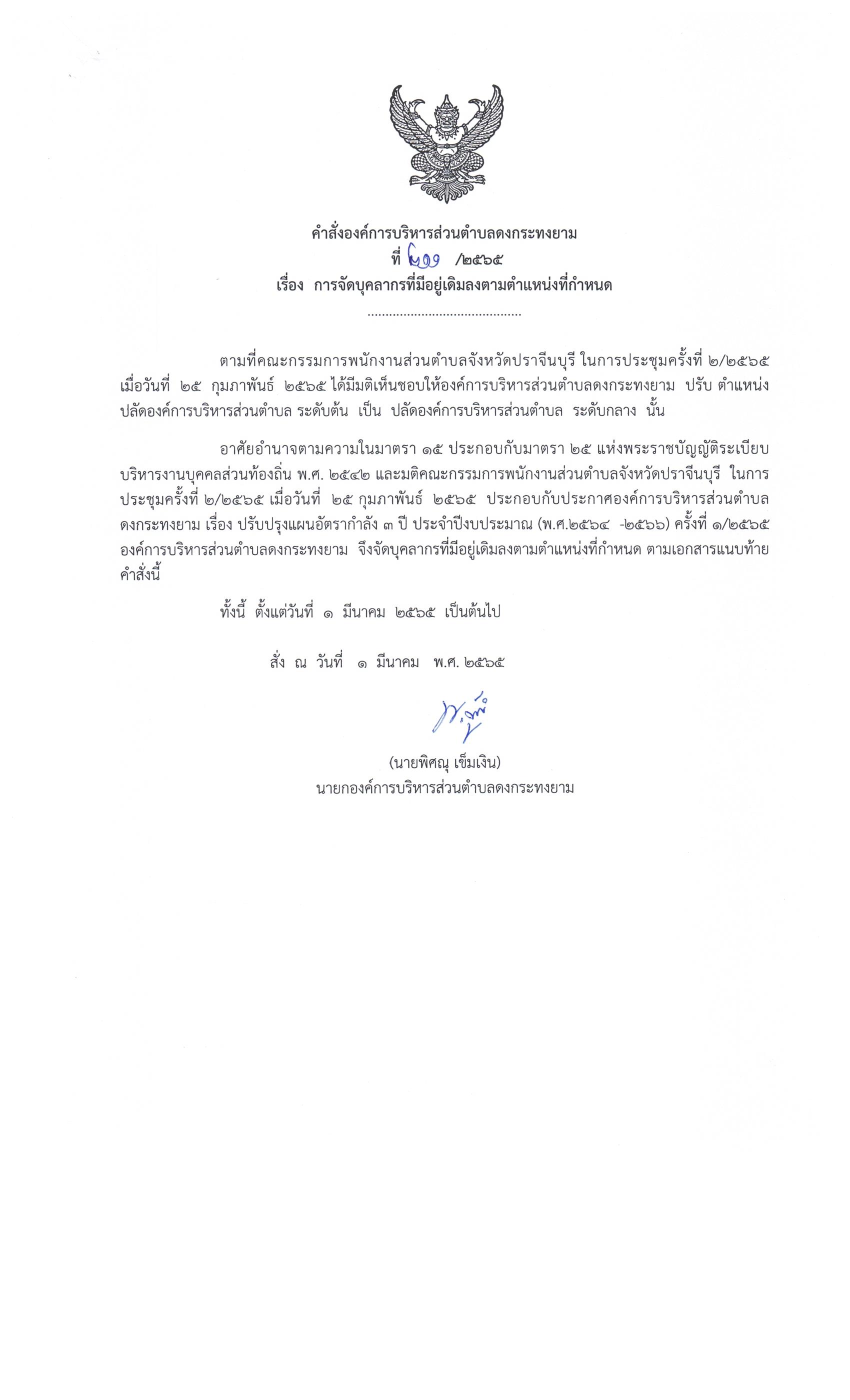 คำสั่ง ที่ 211/2565 เรื่อง การจัดบุคลากรที่มีอยู่เดิมลงตามตำแหน่งที่กำหนด