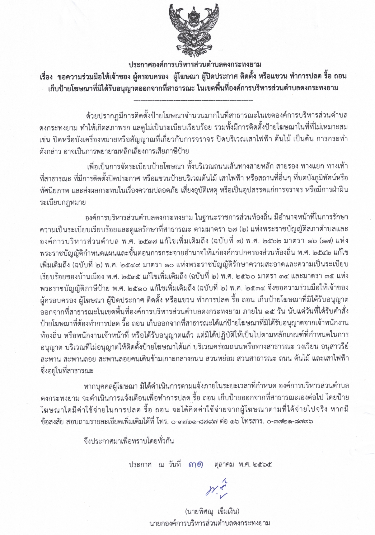 ชื่อเรื่อง : ขอความร่วมมือให้เจ้าของ ผู้ครอบครอง ผู้โฆษณา ผู้ปิดประกาศ ติดตั้ง หรือแขวน ทำการปลด รื้อ ถอน เก็บป้ายโฆษณาที่มิได้รับอนุญาตออกจากสาธารณะ ในเขตพื้นที่องค์การบริหารส่วนตำบลดงกระทงยาม
