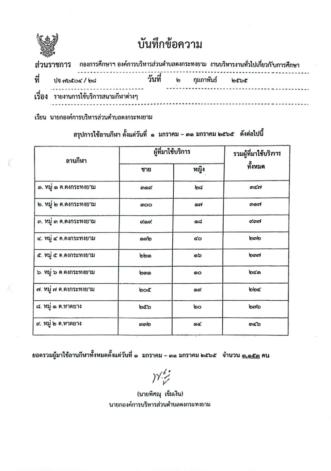 รายงานข้อมูลหรือสถิติการใช้ลานกีฬาหรือสนามกีฬา ประจำเดือน ธันวาคม 2564