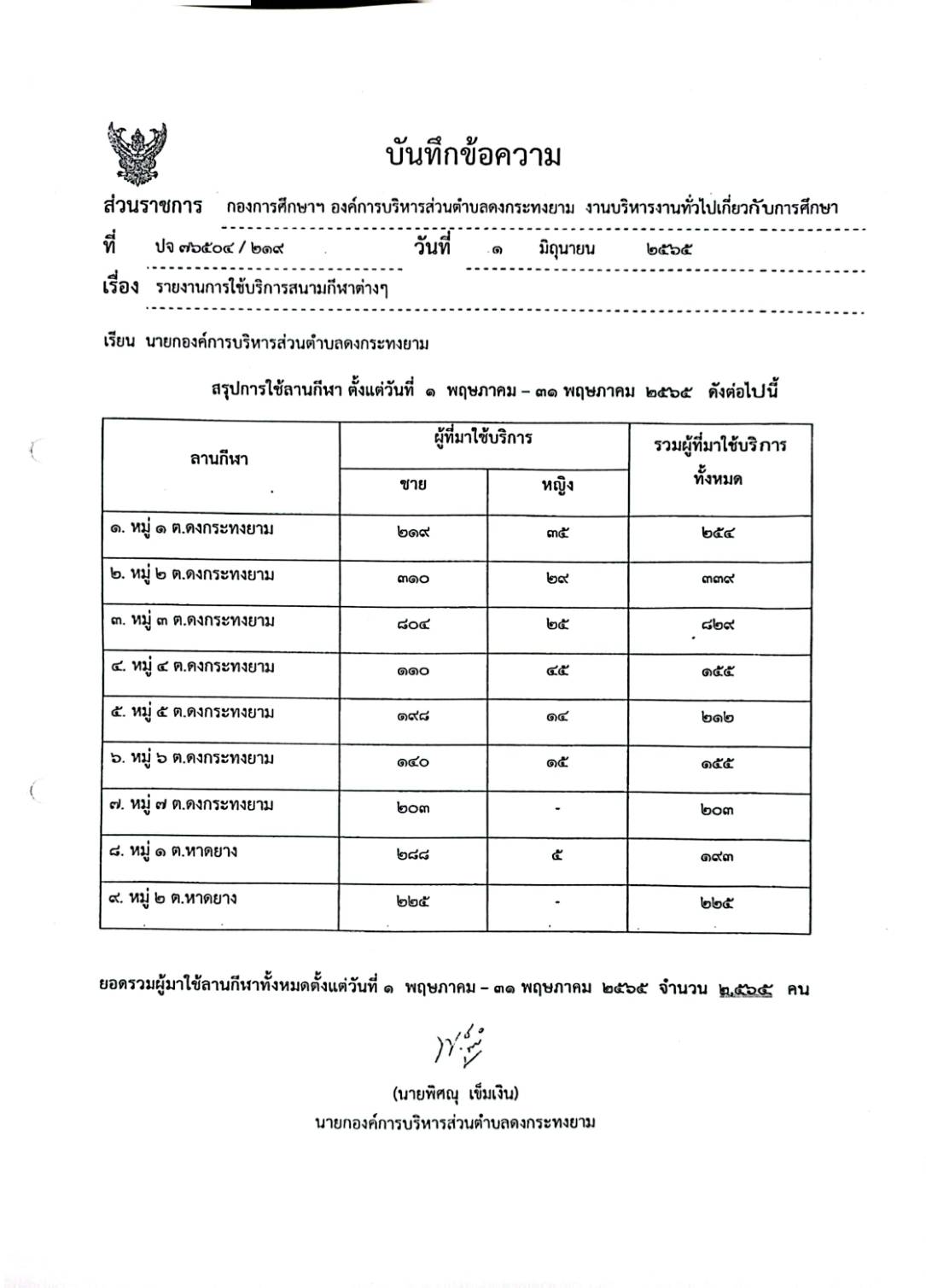 รายงานข้อมูลหรือสถิติการใช้ลานกีฬาหรือสนามกีฬา ประจำเดือน เมษายน 2565