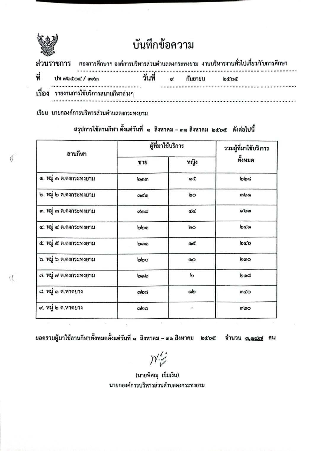 รายงานข้อมูลหรือสถิติการใช้ลานกีฬาหรือสนามกีฬา ประจำเดือน กรกฎาคม 2565
