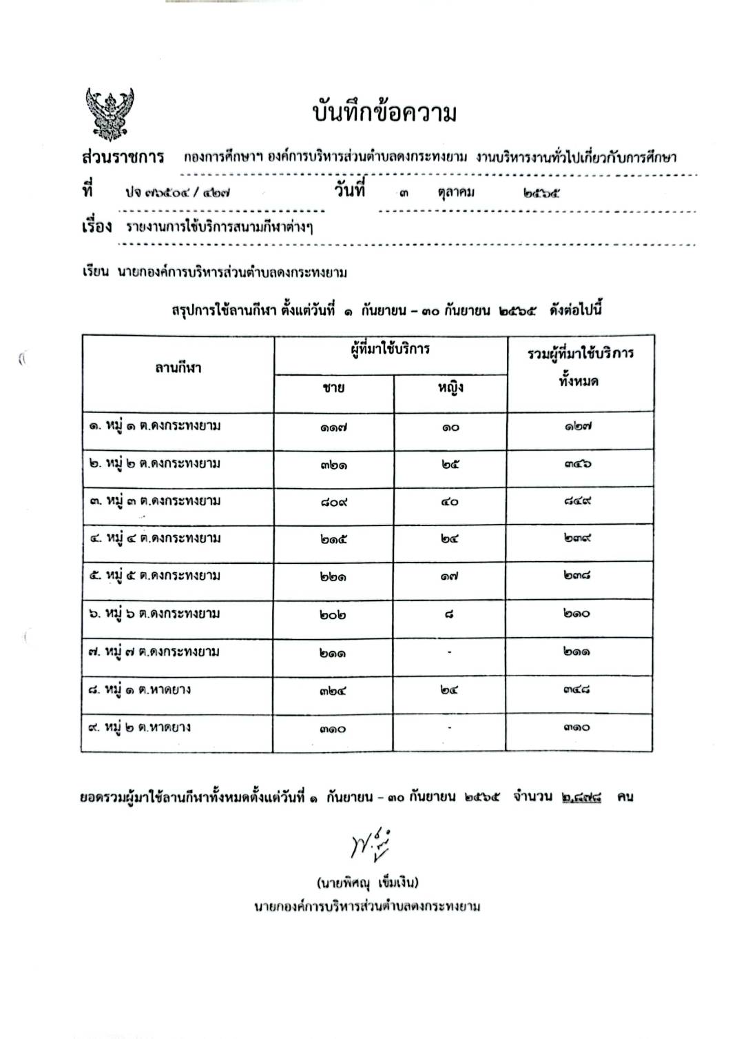 รายงานข้อมูลหรือสถิติการใช้ลานกีฬาหรือสนามกีฬา ประจำเดือน สิงหาคม 2565