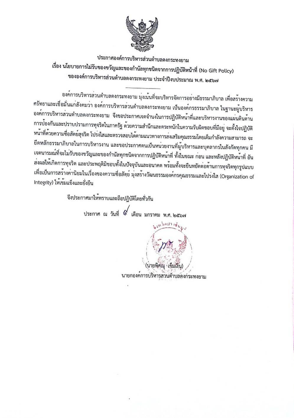 ประกาศนโยบายการไม่รับของขวัญและของกำนัลทุกชนิดจากการปฏิบัติหน้าที่ (No Gift Policy) ของ อบต.ดงกระทงยาม ประจำปีงบประมาณ พ.ศ. 2567