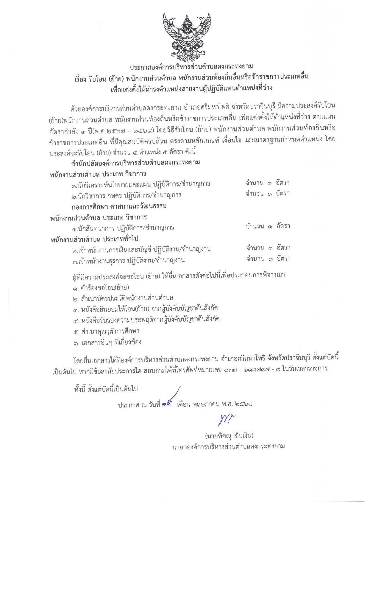 ประชาสัมพันธ์รับโอน (ย้าย) พนักงานส่วนตำบล พนักงานส่วนท้องถิ่นอื่นหรือข้าราชการประเภทอื่น เพื่อแต่งตั้งให้ดำรงตำแหน่งสายงานผู้ปฏิบัติแทนตำแหน่งที่ว่าง